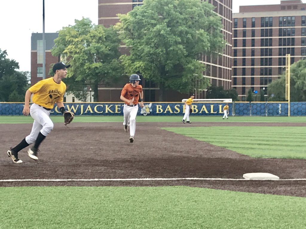 Chase Playfair issues a leadoff walk but fans the next two. Ethan Hurwitz smothers a smash off the bat of Preston Foryt to take us to the bottom of 6: DII Blue 2 DII Red 0 pic.twitter.com/gvsJYNz9yu