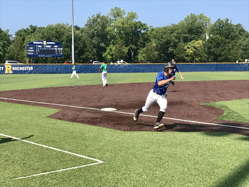 Bobby Sellers (Rush-Henrietta), Dylan Beaupre and Chase Seibold (Brighton) combined on a four hitter to lead DI Blue to its first victory. Sellers started and struck out a pair over three innings, but that was just half off the right-hander’s efforts. Sellers drove in seven runs and scored twice to lead the offense. His two-run triple gave Blue a 6-0 lead in the second, and he delivered an inside-the-park grand slam in the sixth to put the game out of reach. Beaupre fanned four over two innings of work and Siebold closed the game out setting down three on strikes allowing one hit over two innings.
