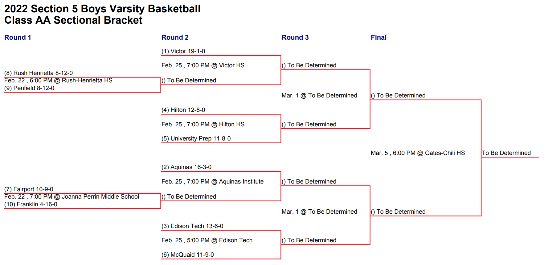 Opponent: Winner of No. 8 Rush-Henrietta vs. No. 9 Penfield. Game scheduled for a 7 p.m. tip off at Victor on February 25th.