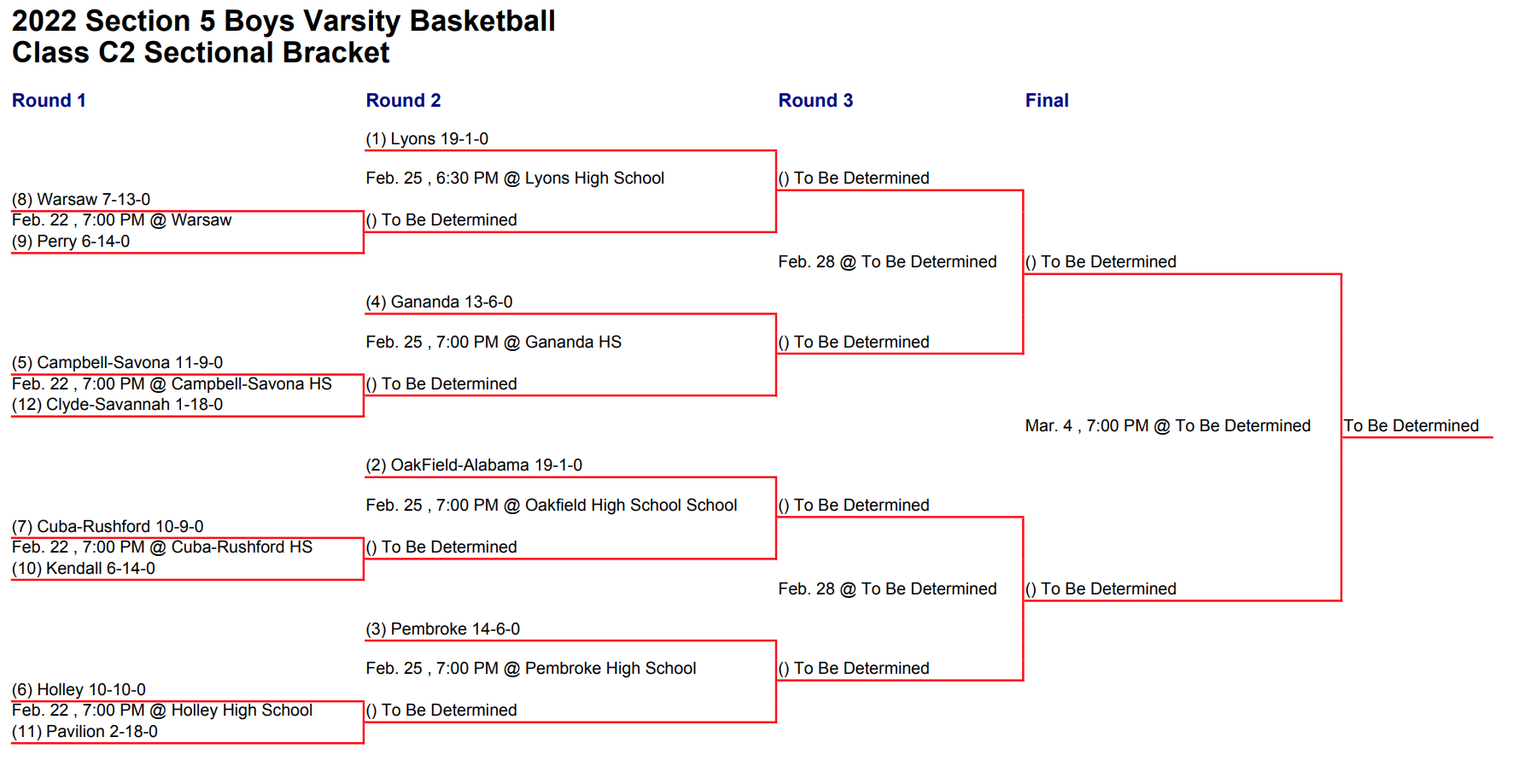 Opponent: Winner of No. 12 Clyde -Savannah at No. 5 Campbell-Savona, February 25th at 7:00 PM at Gananda