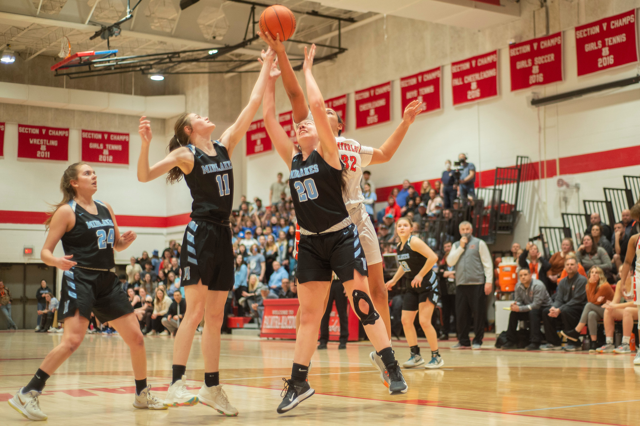 “Typically, she stays out of foul trouble,” Bree said of the senior co-captain. “We don’t practice for that very often. Midlakes is such a good defensive team anyway. We knew it was going to be a battle. We focus on getting her the ball early especially in some sets that we run. Not having her in there hurt, but our kids fight and we find ways. We didn’t shoot the ball that well at all tonight. To come out of here with a win, it shows what they’re all about.”
