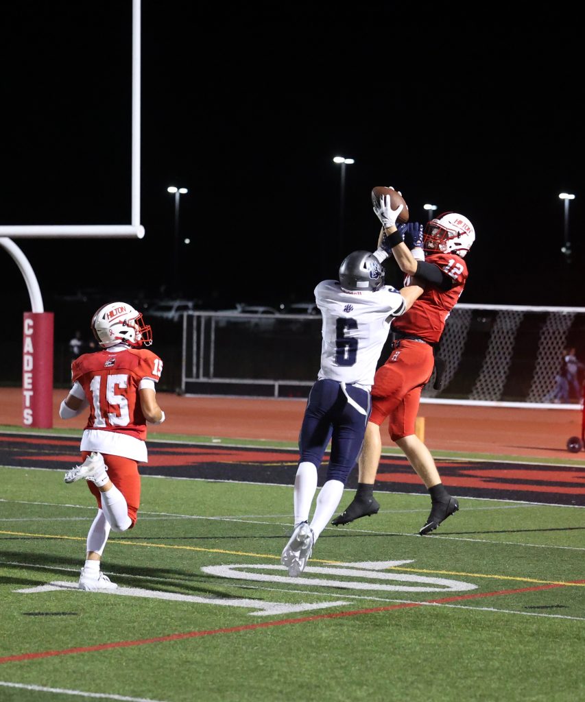 Tyler Reger rushed for 149 yards and two touchdowns while also hitting two field goals as the Hilton Cadets handed defending-champion Brighton its first loss of the season. Matt Kosiorek was 8-for-10 for 104 yards at quarterback and pulled down two interceptions on defense. Calvin Starwald made 15 solo tackles and an interception for the Cadets, while Luca Aurioso added 10 tackles. Zahmar Tookes and Colin Rossignol led Brighton with 10 and nine tackles, respectively, while Matthew Heininger made seven tackles, including two for a loss.