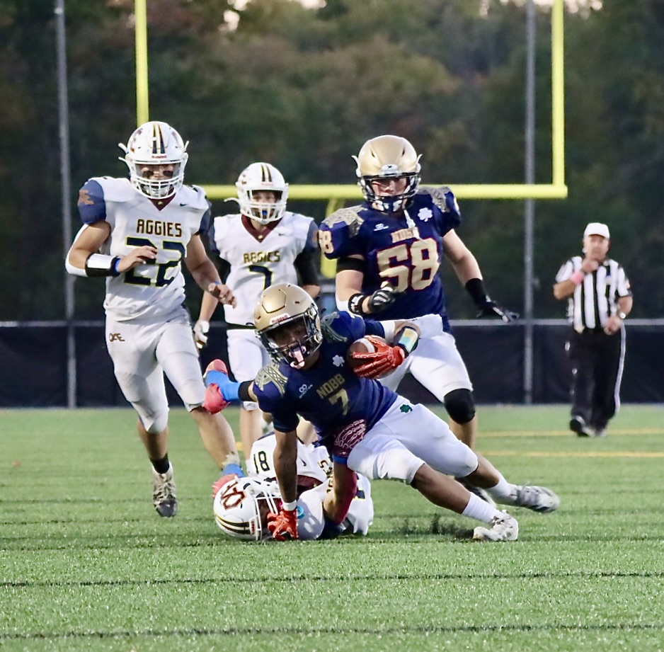 Jeff Logan rushed for 117 yards and scored two touchdowns as Aquinas won its second straight game. The Li’l Irish were led on defense by Brody Lennox, who returned an interception 96 yards for a touchdown and also made eight tackles. Frankie Burgess led the team with 11 tackles, batted down a pass, and recovered a fumble. C.J. Flaherty (10), Amere Brewer (9), and Joey DiProspero (8) were other leading tacklers.