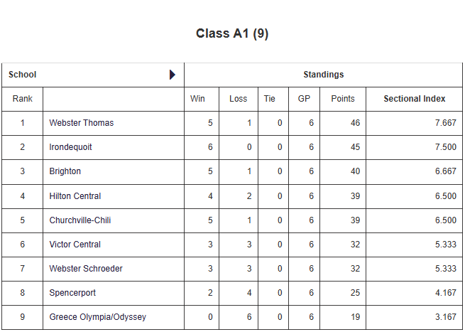 As it stands now, Webster Thomas, with wins over Hilton (4-2), Fairport (3-3), Victor (3-3), and Webster Schroeder (3-3), holds the top position in A1 with 46 sectional points, and a win on Friday would secure a home-game for the Titans in the opening round of sectionals.