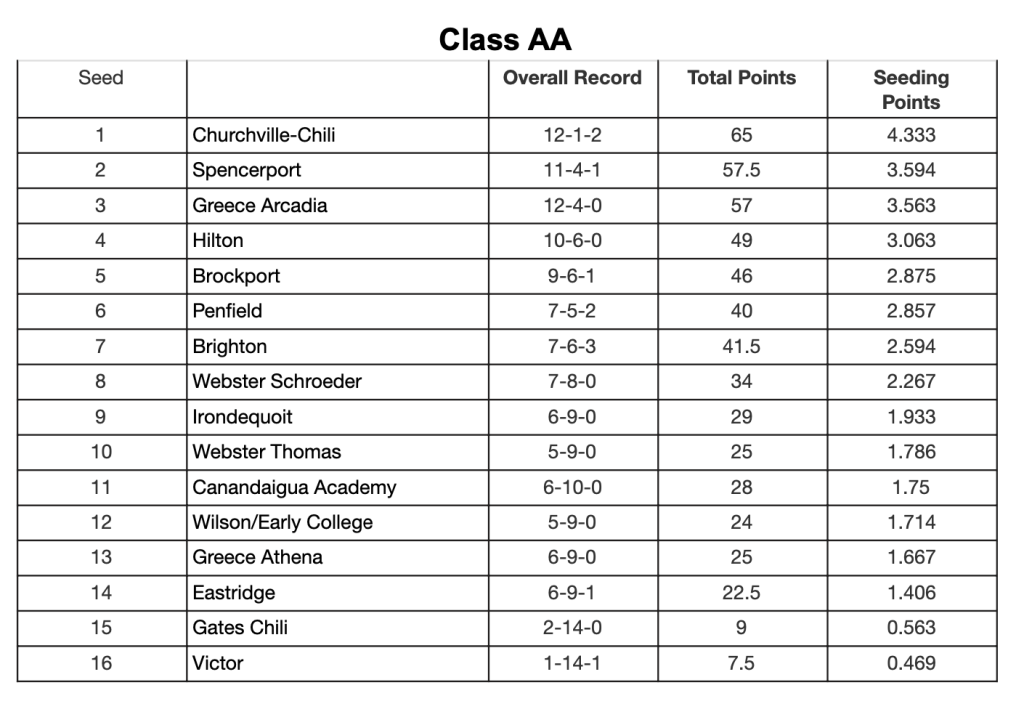 Joining Churchville-Chili and Spencerport in the Class AA field included third-seed 12-4 Greece Arcadia and fourth-seeded 10-6 Hilton. Greece Arcadia aims to earn its 11th title in program history and first since 2016 while Hilton looks to grab its first in four years and fifth in school history. After falling in the first round of playoffs in 2024, Greece Arcadia enters the post season on a six-game win streak while Hilton comes in winning two of its last three.