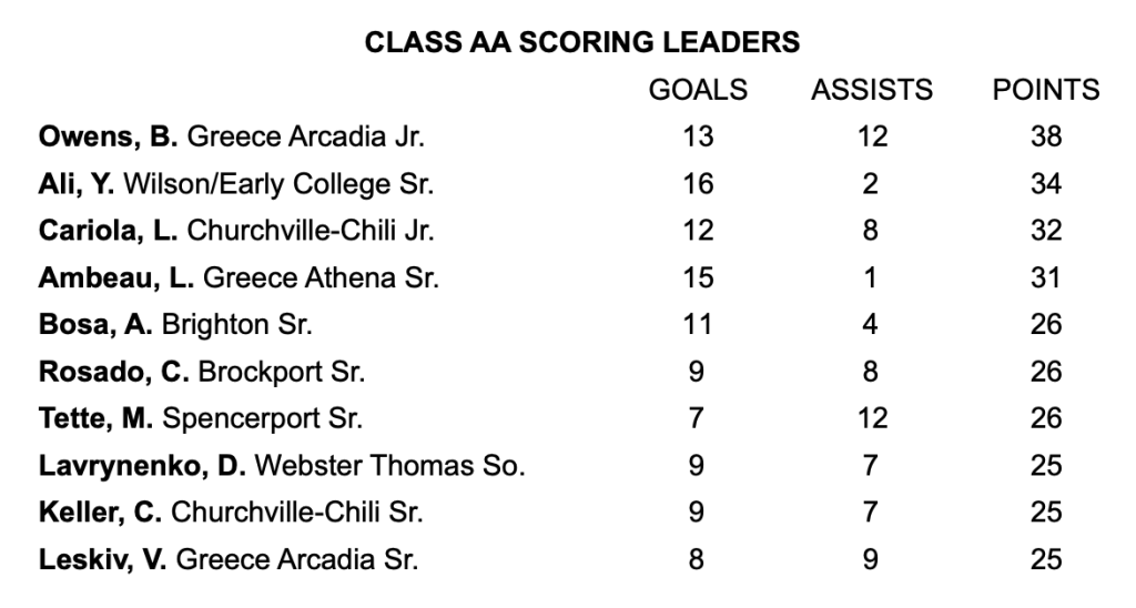 Spencerport, the reigning Class AA champions head into the post season as the No. 2 seed (11-4-1) behind top-seeded Churchville-Chili 12-1-2. Spencerport has won sectionals two of the last three years and is aiming for its 15th in program history. Churchville-Chili last title came in 2023 and is looking for its eighth in school history. In the two regular season matchups, Churchville-Chili edged Spencerport 1-0 in both games. The Saints’ only loss on the season came against reigning Class AAA state champs Fairport.