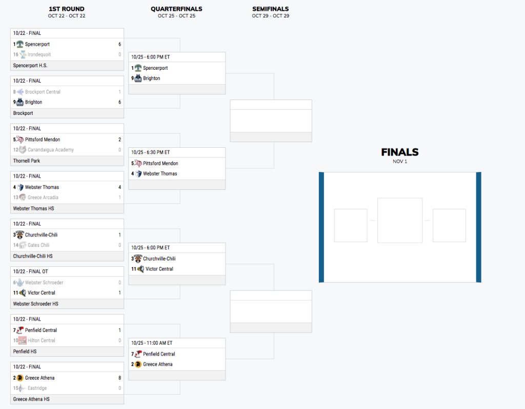 Nine-time reigning champion Spencerport (13-1-1) tops the list with Greece Athena (13-1-1), Churchville-Chili (12-3-0), Webster Thomas (11-4-0) and Webster Schroeder (10-5-1) following.