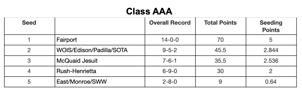 After winning its first ever New York State Championship in 2024, Fairport heads the five-team field with an undefeated 14-0-0 record. The Red Raiders look to win their third straight sectional title and 13th in program history. Fairport recorded 10 shutouts in the regular season as the Red Raiders outscored opponents 44-4.
