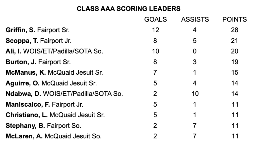 The 2025 Class AAA Boys’ Soccer bracket features five teams: two from Monroe County and three from the Rochester City Atlantic Conference. The tournament kicks off with first round action on Thursday, Oct. 23rd. The finals are scheduled for Tuesday, Nov. 4th at Pittsford Sutherland High School.