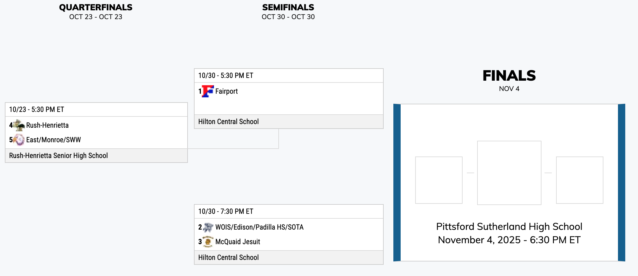 Joining Fairport in the tournament include second-seed WOIS/Edison/Padilla/School of the Arts (9-5-2) and third-seed McQuaid Jesuit (7-6-1). McQuaid Jesuit looks for its first sectional since 2022 and fifth in school history. Last year, the Knights fell to the Red Raiders 3-2 in double overtime. WOIS enters the postseason looking for its first title since 2017 and fourth in program history. In the only head-to-head regular season matchup between the squads, McQuaid Jesuit shutout WOIS 4-0. Rounding out the field include fourth-seeded Rush-Henrietta (6-9) and East/Monroe/School Without Walls (2-8).