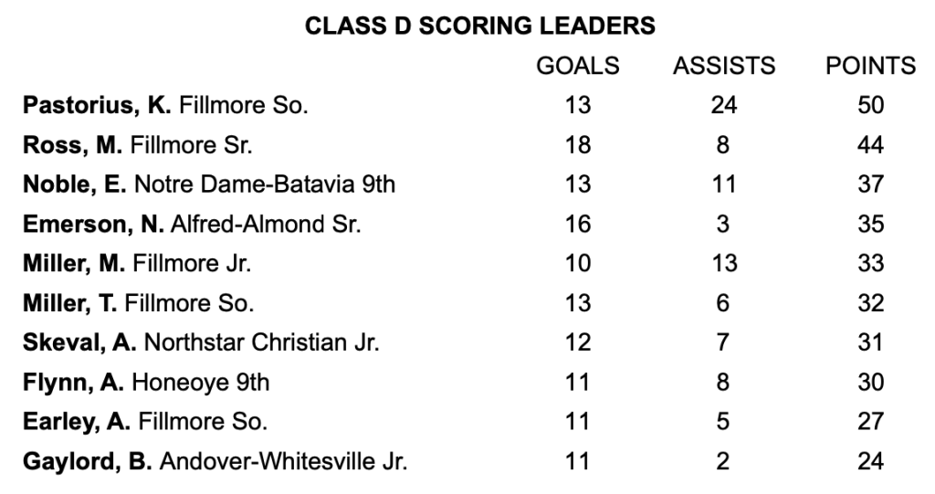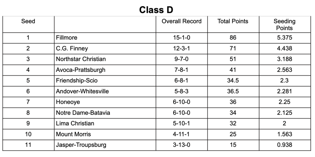 Fillmore and Charles G. Finney headline the Class D field as the only two teams with double-digit wins. Both squads fell in the semi-finals of last year’s tournament and earned the one and two seeds this year.