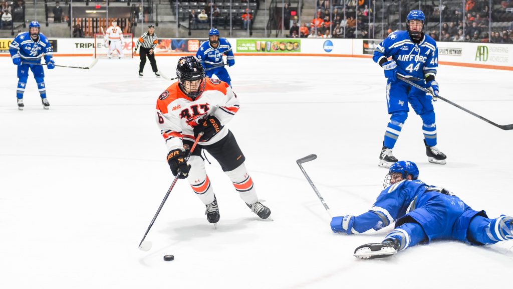 The goal was part of what became a 3-minute and 22-second scoring fest. Between the 10:39 mark and 14:01, the Tigers scored three times – Cobetto-Roy, Zach Wigle and Christian Catalano – and Air Force twice.