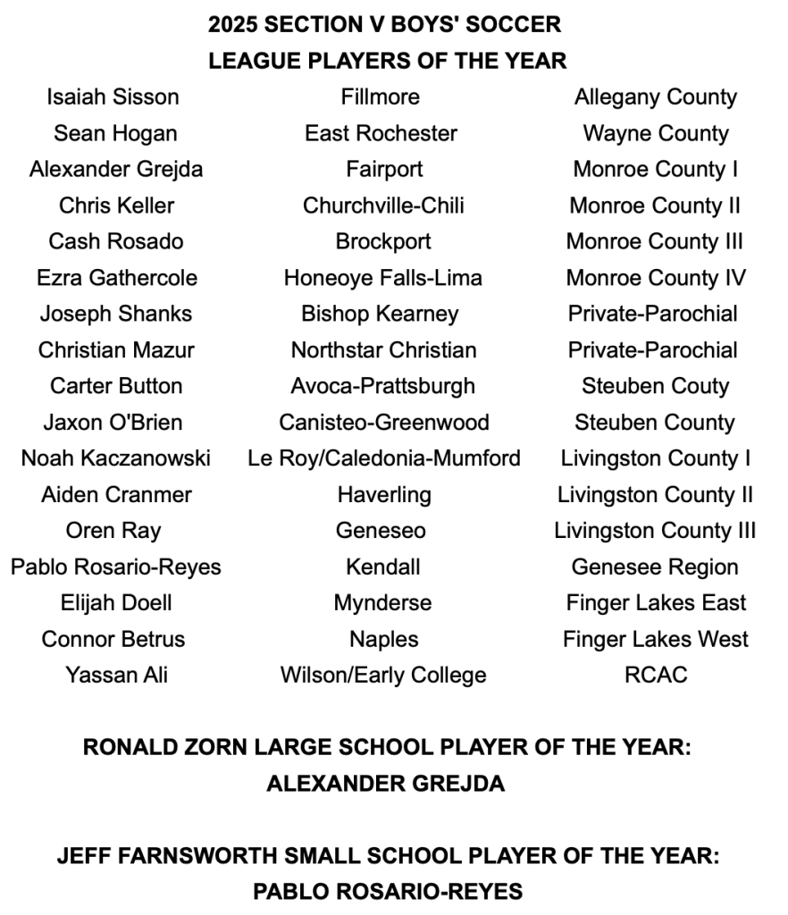 Grejda and Rosario-Reyes headed the list of of student-athletes who earned Player of the Year for respective leagues including Yassan Ali (Wilson/Early College/Rochester City Athletic Conference), Isaiah Sisson (Fillmore/Allegany County), Sean Hogan (East Rochester/Wayne County), Chris Keller (Churchville-Chili/Monroe County II), Cash Rosado (Brockport/Monroe County III), Ezra Gathercole (Honeoye Falls-Lima/Monroe County IV); Cristian Mazur (Northstar Christian/Private-Parochial League), Joseph Alves Shanks (Bishop Kearney/Private-Parochial), Jaxon O’Brien (Canisteo-Greenwood/Steuben County), Carter Button (Avoca-Prattsburgh/Steuben County), Noah Kaczanowski (Le Roy/Caledonia-Mumford/Livingston County Athletic Association I), Aiden Cranmer (Haverling/Livingston County Athletic Association II), Oren Ray (Geneseo/Livingston County Athletic Association III), Elijah Doell (Mynderse/Finger Lakes East) and Connor Betrus (Naples/Finger Lakes West).