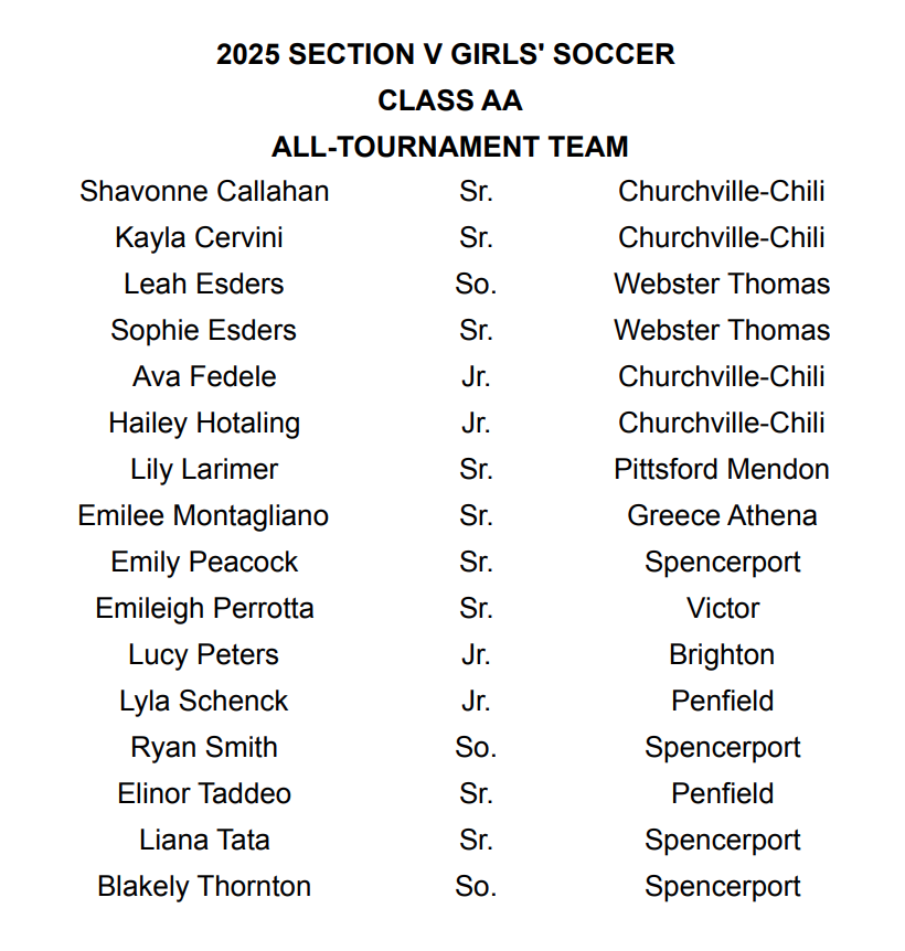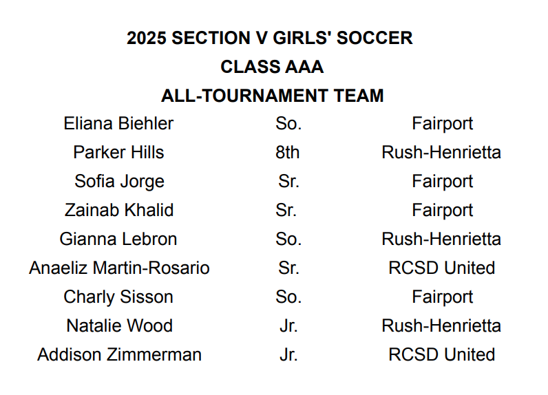 Charly Sisson led the way with a goal and an assist for Fairport which won its third straight Class AAA title and ninth sectional title overall. Sisson was one of four teammates selected for the honor. Eliana Biehler earned her second All-Tournament team selection after adding a goal in the finals. Sofia Jorge and Zainab Khalid joined their teammates on the All-Tournament team. Jorge added an assist in the finals while Khalid was a part of a defense that did not allow a goal.