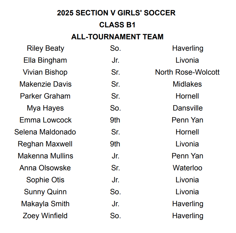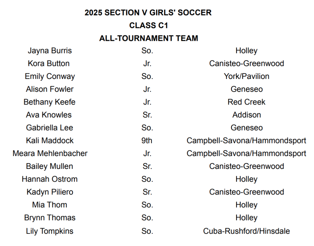 Canisteo-Greenwood’s Kadyn Piliero was named to the All-Tournament team after scoring a goal in the quarterfinals. Teammates Bailey Mullen and Kora Button also were named to the Class C1 team. Geneseo’s Alison Fowler and Gabriella Lee both garnered their second All-Tournament team selections.