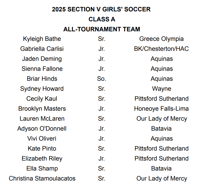 Pittsford Sutherland’s Kate Pinto and Elizabeth Riley each recorded a goal apiece to earn a Class A All-Tournament team selection alongside their teammate Cecily Kaul. Lauren McLaren and Christina Stamoulacatos from Our Lady of Mercy were also named as Class A All-Tournament selections alongside Batavia’s Ella Shamp and Adyson O’Donnell.