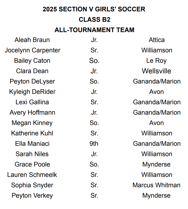 Section V Girls’ Soccer handed out eight sectional championships this season. Alongside those team accomplishments, individuals were recognized by coaches with All-Tournament team honors.