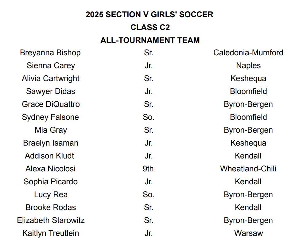 Breyanna Bishop (Caledonia-Mumford), Alexa Nicolosi (Wheatland-Chili), Kaitlyn Treutlein (Warsaw) and Sienna Carey (Naples) rounded out the selections for the Class C2 All-Tournament team.