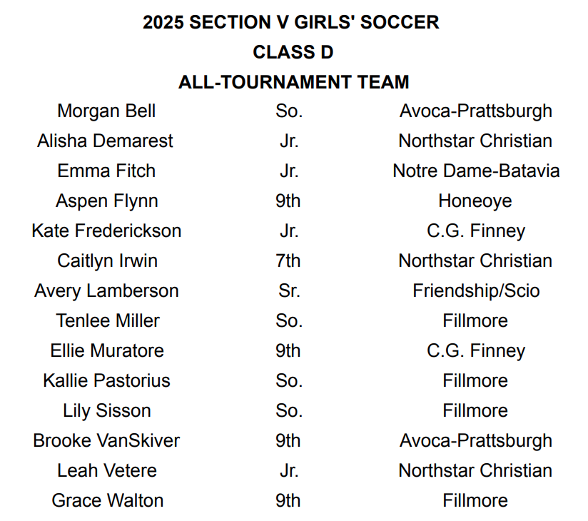 Kate Frederickson and Ellie Muratore both represented Class D semifinalists C.G. Finney on the All-Tournament team. Avoca-Prattsburgh’s Morgan Bell and Brooke VanSkiver were also represented on the All-Tournament team.