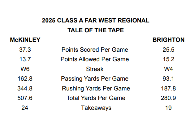 How they got here: Brighton (No. 17 Class A NYSSWA) won a sectional championship after taking down Churchville-Chili (35-14), Irondequoit (7-6), and Webster Schroeder (30-20). The Bruins defeated East/World of Inquiry 24-14 in the Section V Class A State Qualifier to clinch their spot in the Far West Regional. McKinley (No. 6 Class A NYSSWA) beat Clarence (36-14) in the first round of the Section VI playoffs, Grand Island (22-0) in the semifinals, and Health Sciences/BASC/Global Concepts (38-14) in the championship game.