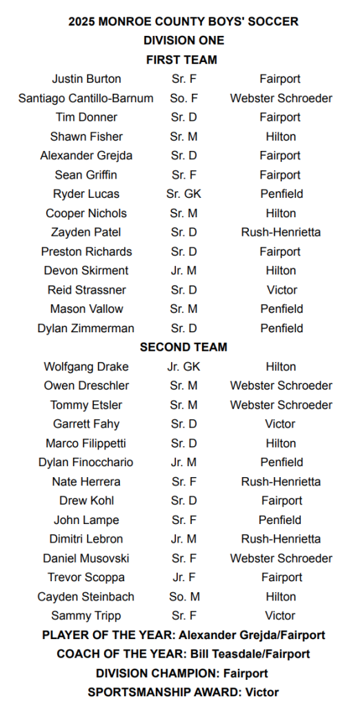 Joining Grejda on the Division I First Team include teammates Sean Griffin, Preston Richards, Justin Burton and Tim Donner. Griffin led Division I in goals scored with 12 and finished the year with 16. Cooper Nichols, Shawn Fisher and Devon Skirment earned honors out of Hilton while the Penfield trio of Mason Vallow, Dylan Zimmermann and Ryder Lucas were recognized as well. Santiago Cantillo-Barnum (Webster Schroeder), Zayden Patel (Rush-Henrietta) and Reid Strassner (Victor) all received first-team selections.