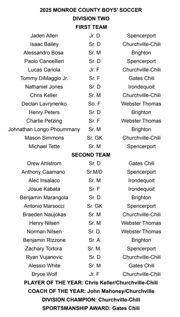 Joining Keller on the Division II First Team include the division leader in goals and fellow Saint Lucas Cariola with 12 goals in the regular season and 15 total. Teammates Mason Simmons and Isaac Bailey joined the team as well while Paolo Cancellieri, Michael Tette and Jaden Allen all earned selections out of Spencerport. Brighton’s Johnathan Phoummany, Alessandro Bosa and Henry Peters received first-team honors while the Webster Thomas duo of Charlie Petzing and Declan Lavyrnenko got nods as well. Nathaniel Jones (Irondequoit) and Tommy Dimaggio Jr. (Gates Chili) round out the squad.