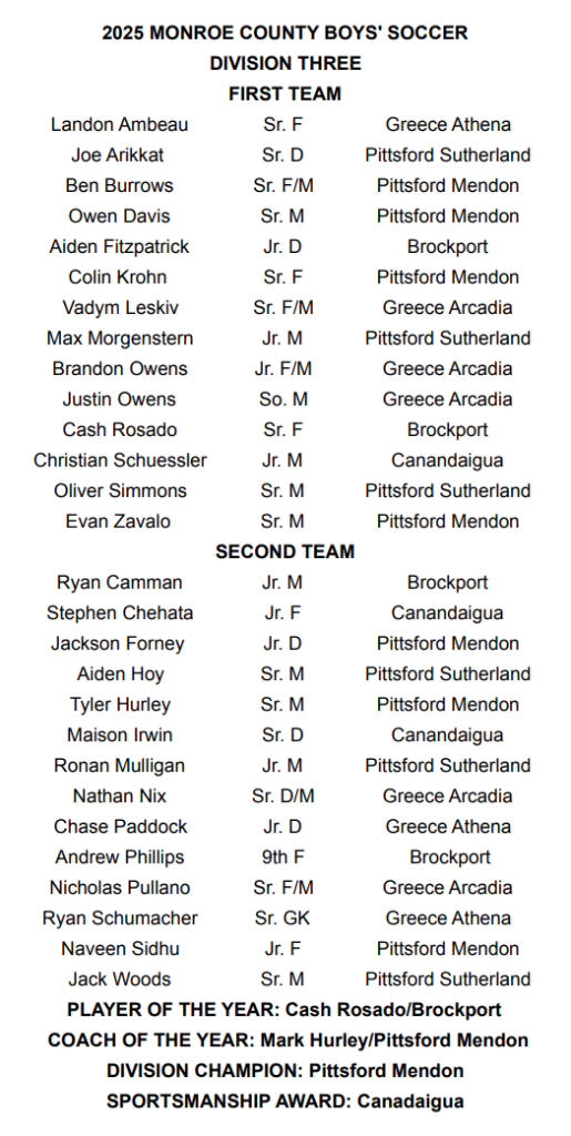 Joining Rosado on the Division III First Team includes fellow Blue Devil Aiden Fitzpatrick along with Colin Krohn, Ben Burrows, Evan Zavalo and Owen Davis of the 22-time sectional champions and winners of Monroe County Division III Pittsford Mendon. Max Morgenstern, Oliver Simmons and Joe Arikkat got nods out of Pittsford Sutherland while the Greece Arcadia trio of Bradon Owens, Vadym Leskiv and Justin Owens earned selections as well. Brandon Owens led all of Division III with 13 goals and 12 assists in the regular season for a total of 38 points. Landon Ambeau (Greece Athena) and Christopher Schuessler (Canandaigua) round out the first team.