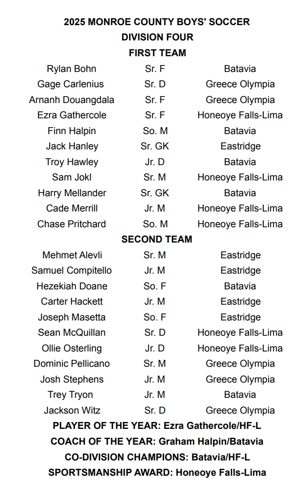 Teammates Sam Jokl, Cade Merrill and Chase Pritchard join Gathercole on the Division IV First Team while Troy Hawley, Finn Halpin, Harry Mellander and Rylan Bohn earned selections from Batavia. The duo of Arnanh Douangdala and Gage Carlenius were recognized out of Greece Olympia while Eastridge’s Jack Hanley received an honor as well.