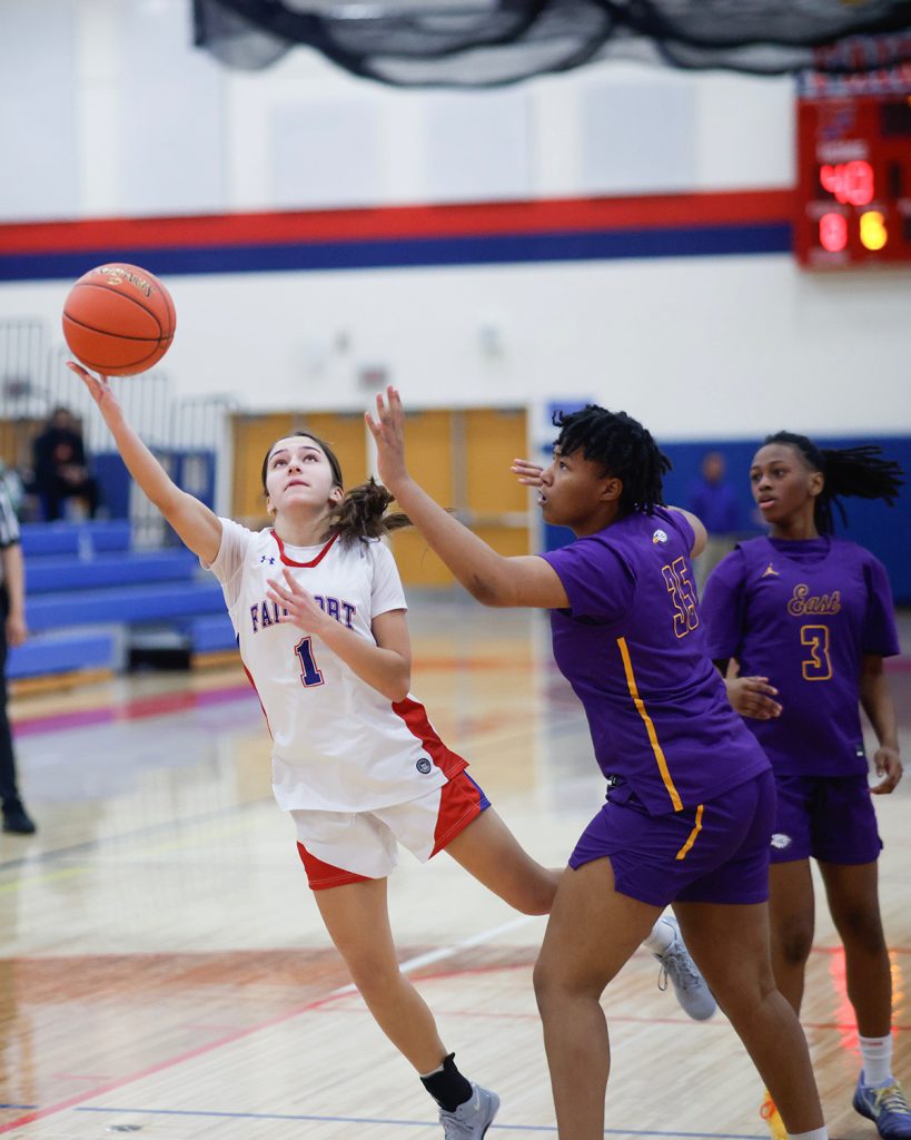 Eva Monoski poured in 16 points, as Fairport defended home court to win its second in a row. Monoski drilled four jumpers from beyond the arc. Samara Rizzo followed with 14 points and made three from deep. Charly Sisson added 10 points. Autumn Fitch drilled a pair from deep. Avery Lucey tacked on nine points. Leah Meabon and Brinn Castrechini both had four points. For East, Darianna Weathers scored a game-high 25 points and netted four shots from three-point range. Semaj Jackson followed with 13 points for the Eagles.