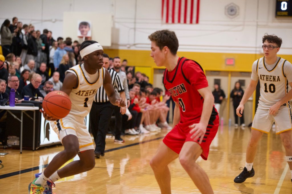 Cole Poth scored 20 points, including seven in the final quarter, as Athena moved above .500 on the season. The senior was five-for-six from the charity stripe. Russell Ellis scored 19 points, including a perfect eight-for-eight in free throws. Caleb Brown also reached double digits, with 14 points. Shabazz Barnes (8) and Colten Waterman (6) also scored. Tyler Rege and Kallin Whelehan both scored 12 points for the Hilton Cadets. Jackson Oliveri had eight points, while Cooper Streb and Shane Thompson both scored six points. Matthew Kosiorek added another five points, while three players scored two points each for Hilton: Jackson Esposito, Lucas Smith, and Jacob Nguyen.