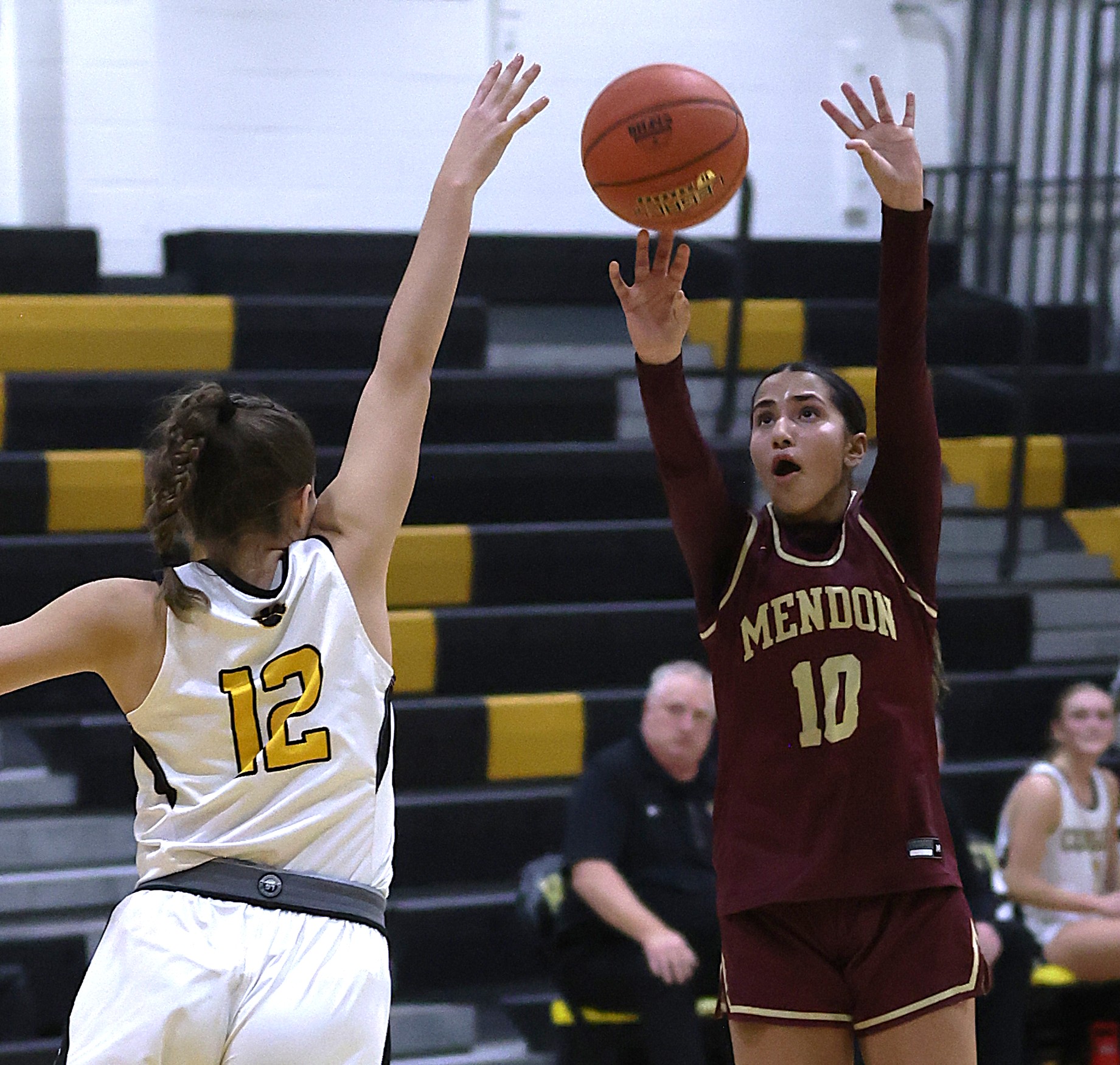 Leading 13-11 after the first quarter, Pittsford Mendon held Honeoye Falls-Lima to just eight made field goals in the final three quarters, and five points in the fourth quarter. Coach Julien’s key to the game was to slow down Honeoye Falls-Lima forward Shaye Angelo, who finished with 21 points.