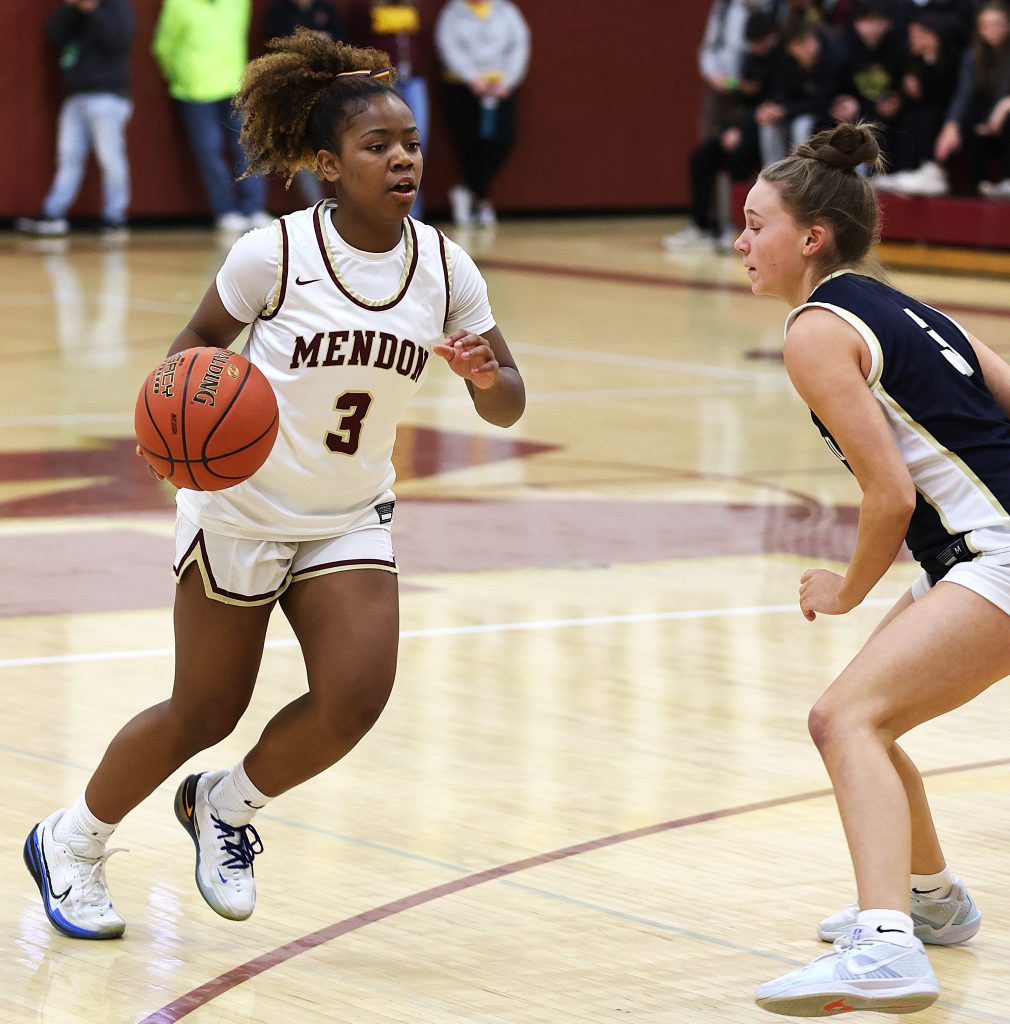 Mendon responded and scored the next six. Camryn Hernick’s bucket cut the deficit to three at 39-36. It was still a three-point game at 41-38 when Eva Dixon finished in the lane.