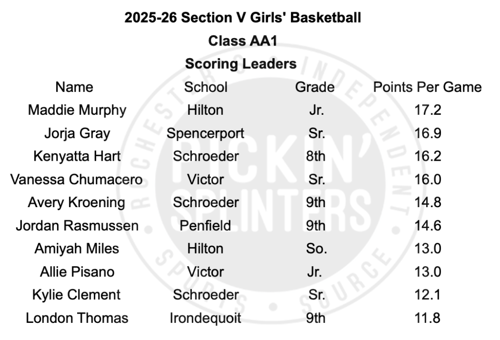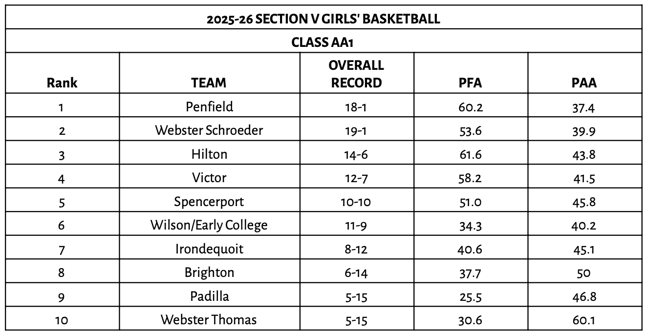 The 2026 Section V Class AA1 Girls’ Basketball bracket features four teams from Monroe County Division I, four teams from Monroe County Division II, and two teams from the Rochester City Athletic Conference.