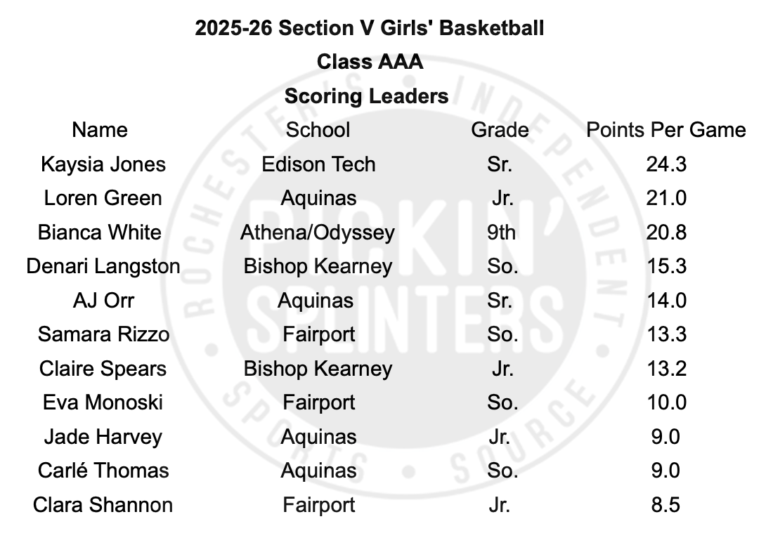 The 2026 Section V Class AAA Girls’ Basketball bracket features two teams from Monroe County Division I, two teams from Monroe County Division II, two Private/Parochial teams, and one team from the Rochester City Athletic Conference.
