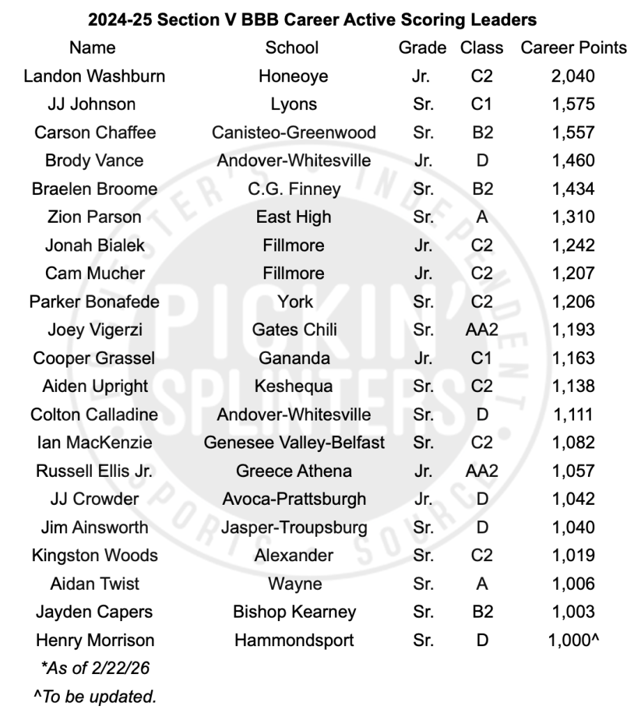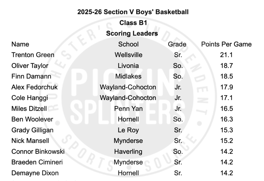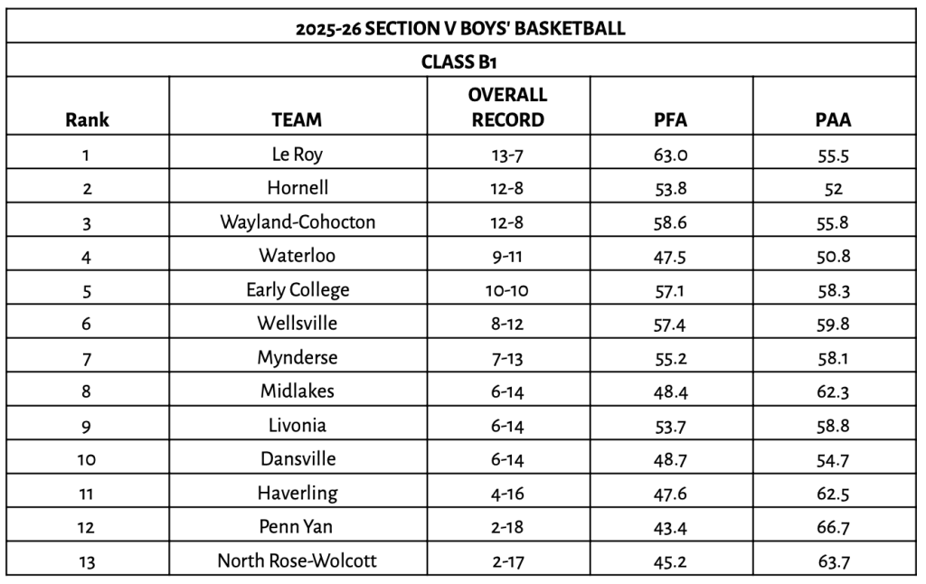The 2026 Section V Class B1 Boys’ Basketball bracket features all five teams from Livingston County Division I, four from Finger Lakes East, two from Section V Independent and one each from Livingston County Division II and Wayne County. First round action tips off on Wednesday, Feb. 25 with 10 teams fighting for a spot in the quarterfinals. The B1 final will be held at Blue Cross Arena on March 6.