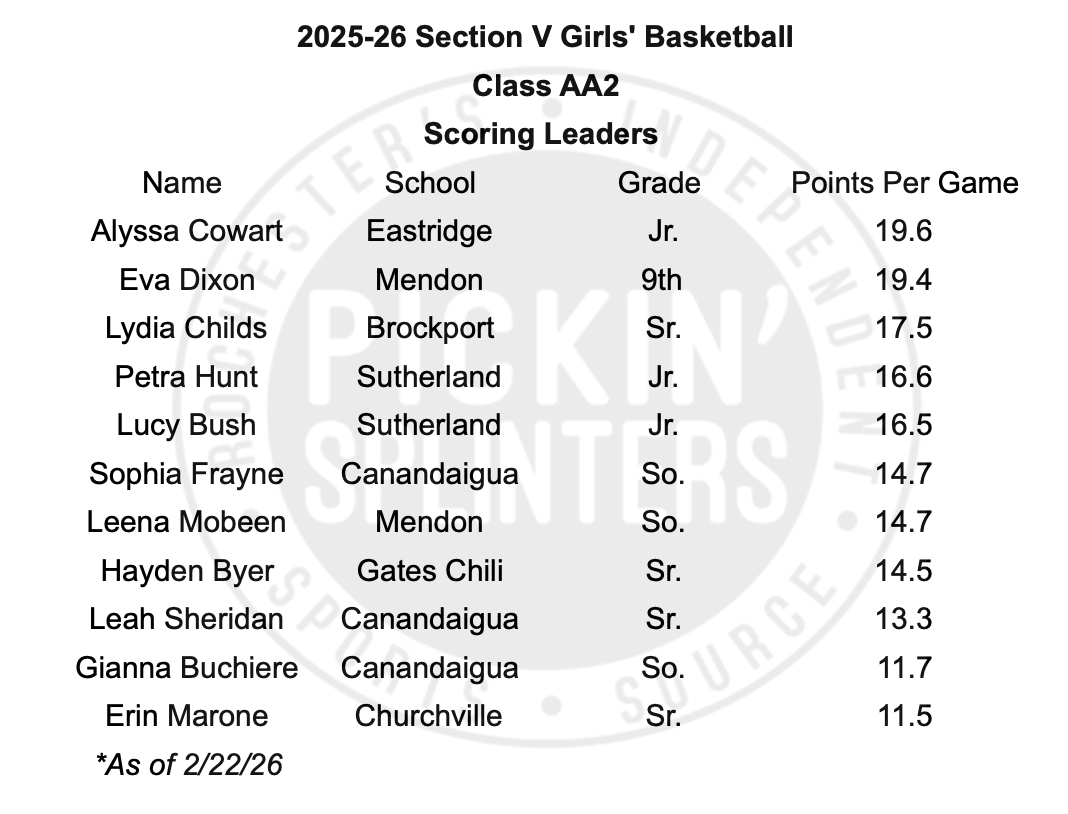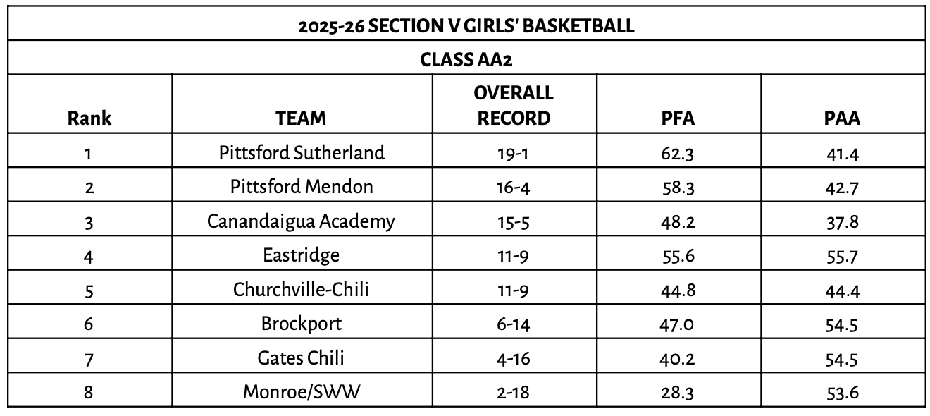 The 2026 Section V Class AA2 Girls’ Basketball bracket features four teams from Monroe County Division III, two teams from Monroe County Division two, one team from Monroe County Division IV, and one team from the Rochester City Athletic Conference.