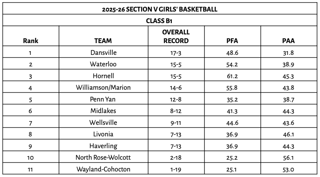 The 2026 Section V Class B1 Girls’ Basketball bracket features five teams from Livingston County Division I, three from Finger Lakes East, two representatives from Wayne County and one squad from Section V Independent. First-round matchups tipped off on Saturday, February 21 at 2 p.m. and the final two teams will battle in the Class B1 championship on Wednesday, March 4 scheduled for 8 p.m. at Finger Lakes Community College.