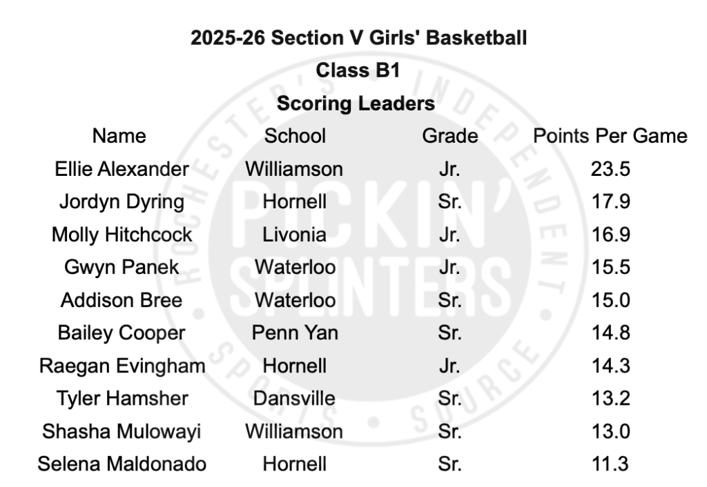 No. 3 Hornell enters the tournament as the reigning champions of Class B1. The Red Raiders finished with a 15-5 record, claiming three straight victories to end its season. Williamson/Marion grabbed the No. 4 seed with a 14-6 record including four straight wins to close its season. No. 5 Penn Yan closed out its season with 12-8 record. Here’s the breakdown: