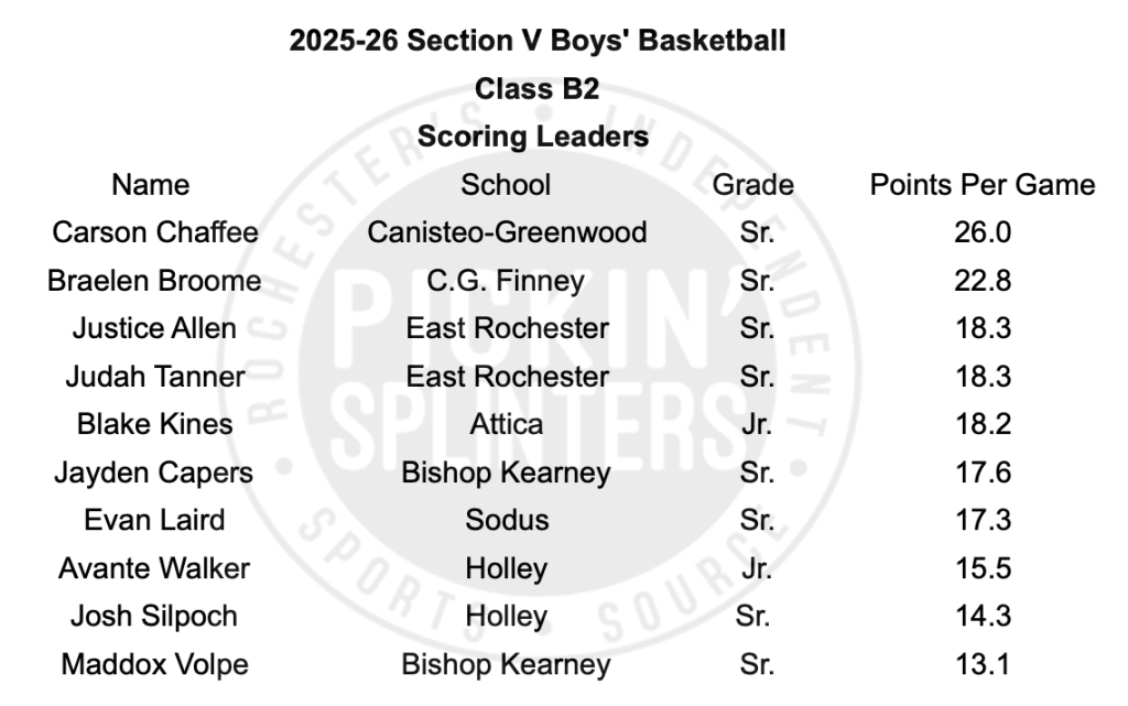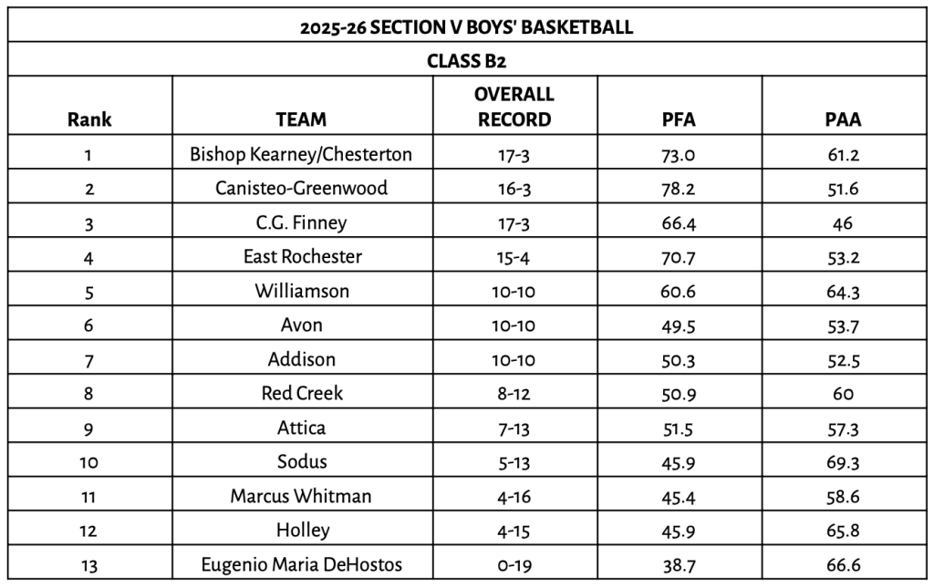 The 2026 Section V Class B2 Boys’ Basketball bracket features four teams from Wayne County, three from the Private-Parochial League, two each from Steuben County and Genesee Region I along one apiece from Livingston County Division II and Section V Independent. First round action tips off on Wednesday, Feb. 25 with 10 teams fighting for a spot in the quarterfinals. The B2 final will be held at Blue Cross Arena on March 6.