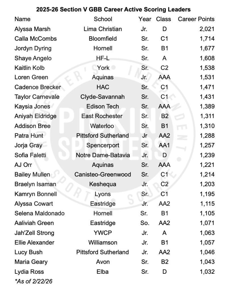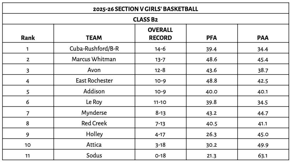 The 2026 Section V Class B2 Girls’ Basketball bracket features three teams from Wayne County, two apiece from Livingston County II and Genesee Region I along with one each from Finger Lakes East, Steuben County, Allegany County I and Section V Independent. First-round matchups tip off on Saturday, February 21 and the final two teams will meet on Wednesday, March 4 at Finger Lakes Community College.
