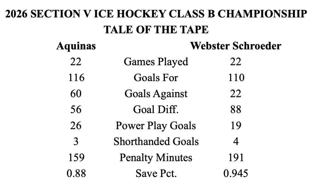 History 101: Webster Schroeder is seeking its first Class B title since 2023. Aquinas is seeking its first sectional title since 1999 when they won the state tournament. The last time these two teams met was last season January 8, 2025 where the Warriors 6-3.