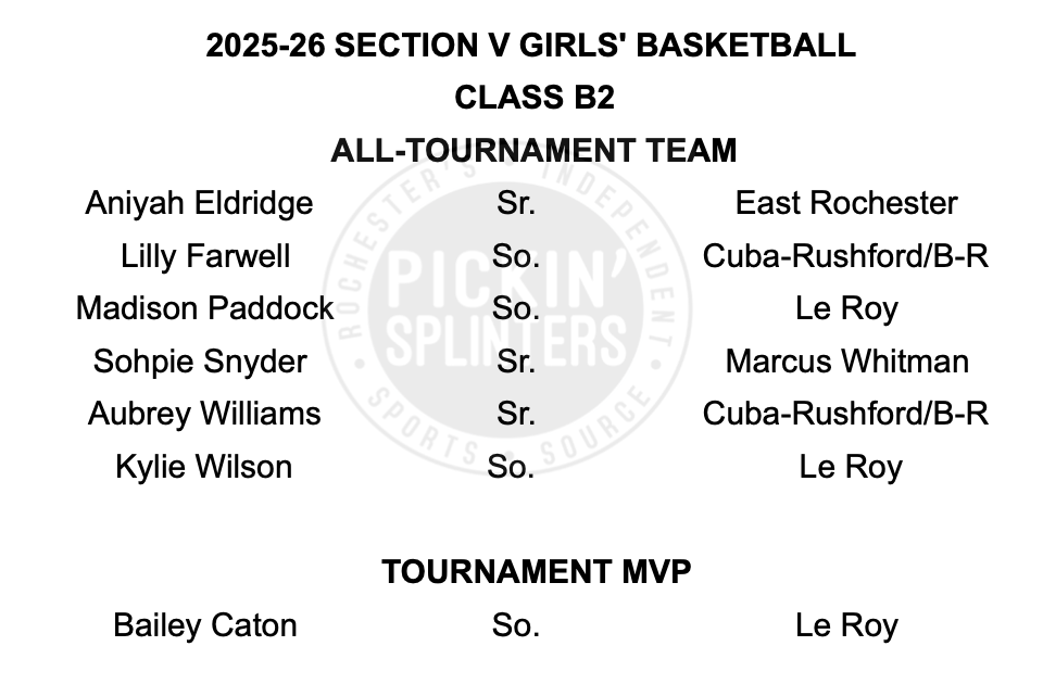 Caton notched six of her team-high 12 points in overtime to lift LeRoy to its second sectional title with a 50-42 victory over Cuba-Rushford/Bolivar-Richburg. The sophomore chipped in eight points in the Oatkan Knights 44-37 win against Marcus Whitman as Caton averaged 10 points per game to earn her first Class B2 Tournament MVP.