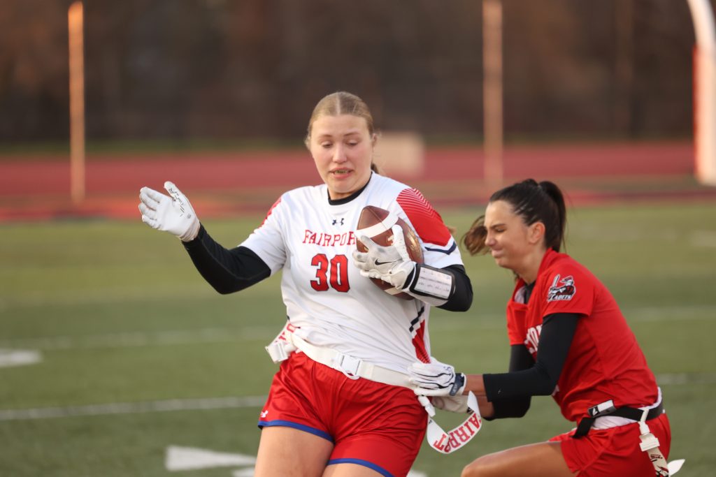Fairport’s Ava Vassallo had 22 completions for 196 yards and four touchdowns. Kate Pecora led the Red Raiders in rushing with 26 yards. Carlin Lowe had nine flag pulls, while Avery Lucey had three flag pulls and two interceptions. Natalie Panara (7, with one for a loss and one sack) and Julia McNulty (6, with one for a loss) were among other flag-pull leaders. Mallory Foote punted three times for Fairport, averaging 42 yards with the longest going 65 yards.