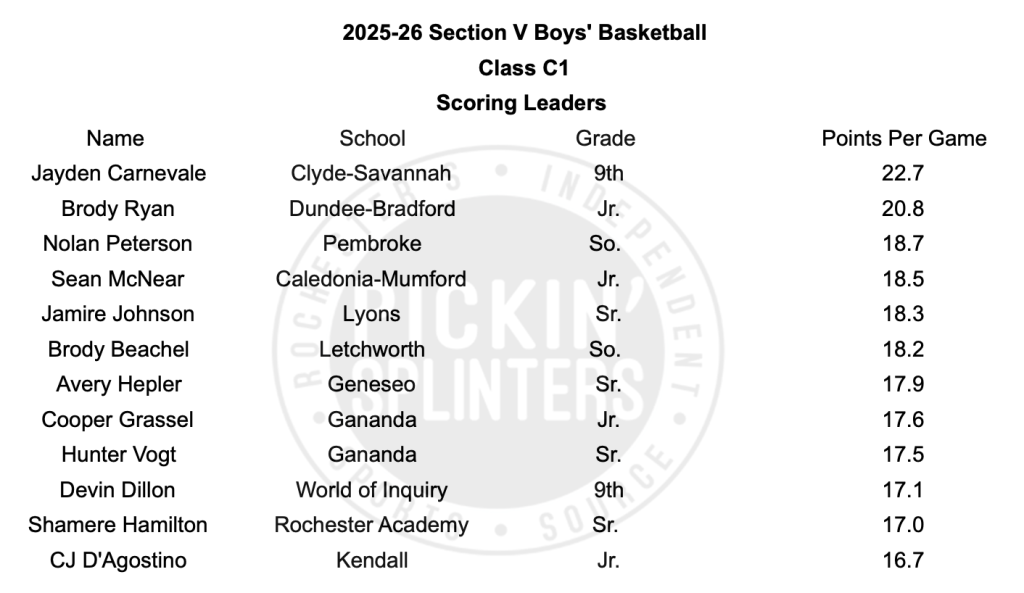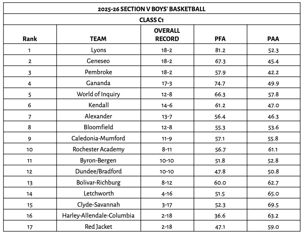 The 2026 Section V Class C1 Boys’ Basketball bracket features four teams from Genesee County Division I, four teams from Finger Lakes West, three teams from Wayne County, three teams from Livingston County Division II, one team from the Rochester City Athletic Conference, one team from Allegany County Division I and one Private-Parochial school.