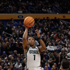 BY DYLAN O'LOUGHLIN BUFFALO, N.Y. --- Coen Carr finished with a game-high double-double of 21 points and 10 rebounds while Jeremy Fears Jr finished with a 12-point, 16-assist double-double to lead the No. 3 Michigan State Spartans to a 77-69 Round of 32 victory over the No. 6 Louisville Cardinals. Up five coming out of the locker room, Carr netted 14 points in the final 20 … [Read more...] about Carr and Fears double-doubles lead Michigan State to 23rd Sweet 16
